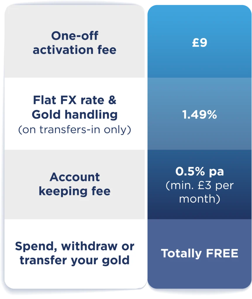 Yes, we have fees. But unlike other financial institutions, we don’t rip you off with hidden FX fees or commission. We are the only company where you can buy, hold, or spend gold at the global spot rate.