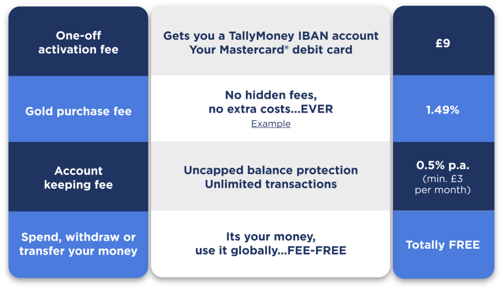 Transfer £100 to your TallyMoney app, we charge 1.49% (£1.49), for the purchase of the gold.